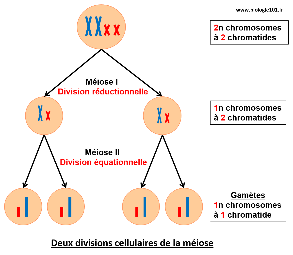 La méiose permet le passage de cellules germinales diploïdes à des cellules haploïdes (les gamètes). C’est au sein de l’appareil reproducteur (testicules et ovaires chez les animaux, étamines et ovaire chez les végétaux) que se déroule la méiose. Un gamète est une cellule reproductrice sexuelle haploïde (à n chromosomes) capable de fusionner avec un autre gamète pour former une cellule-œuf ou zygote diploïde (à 2n chromosomes).
